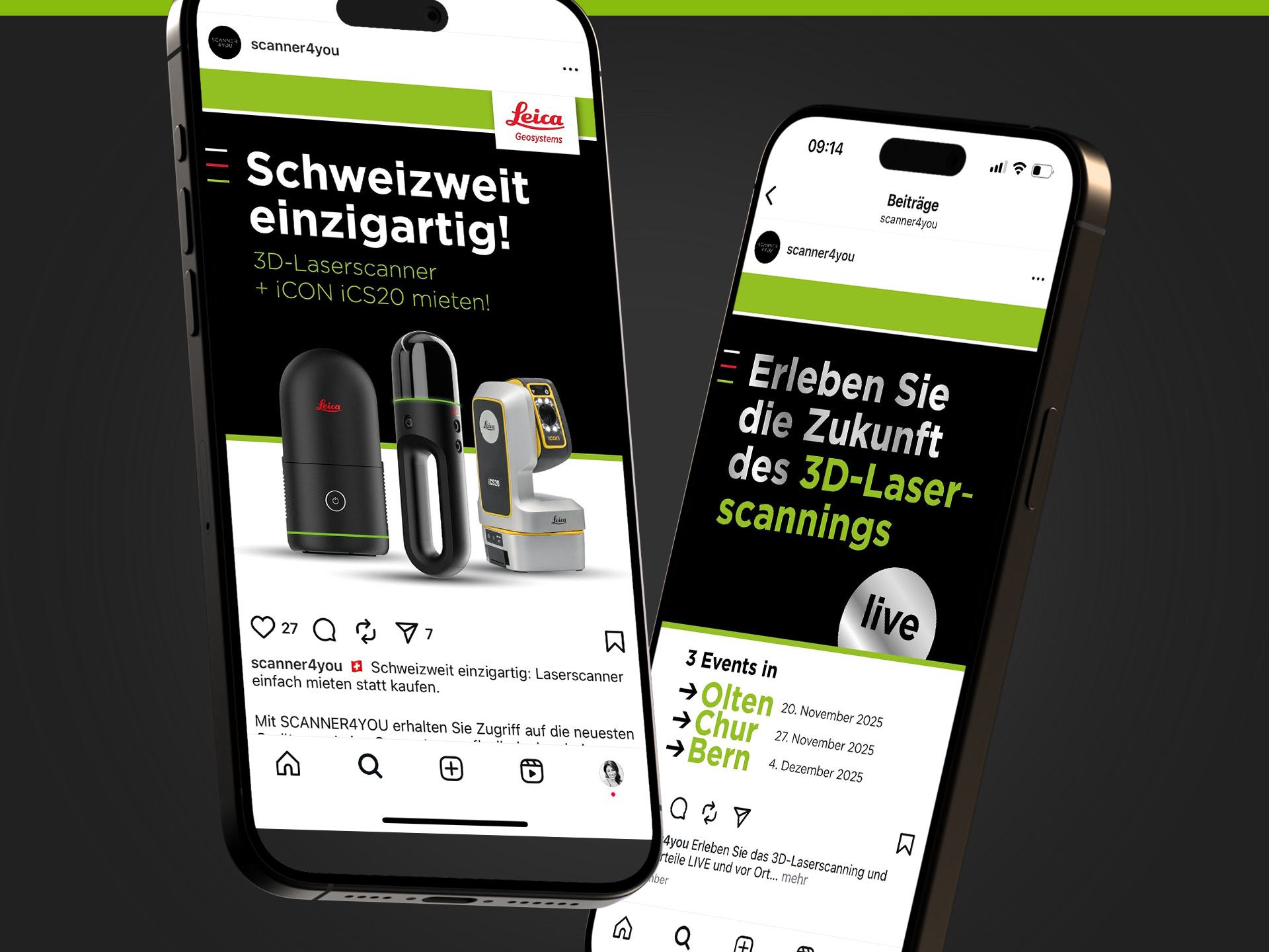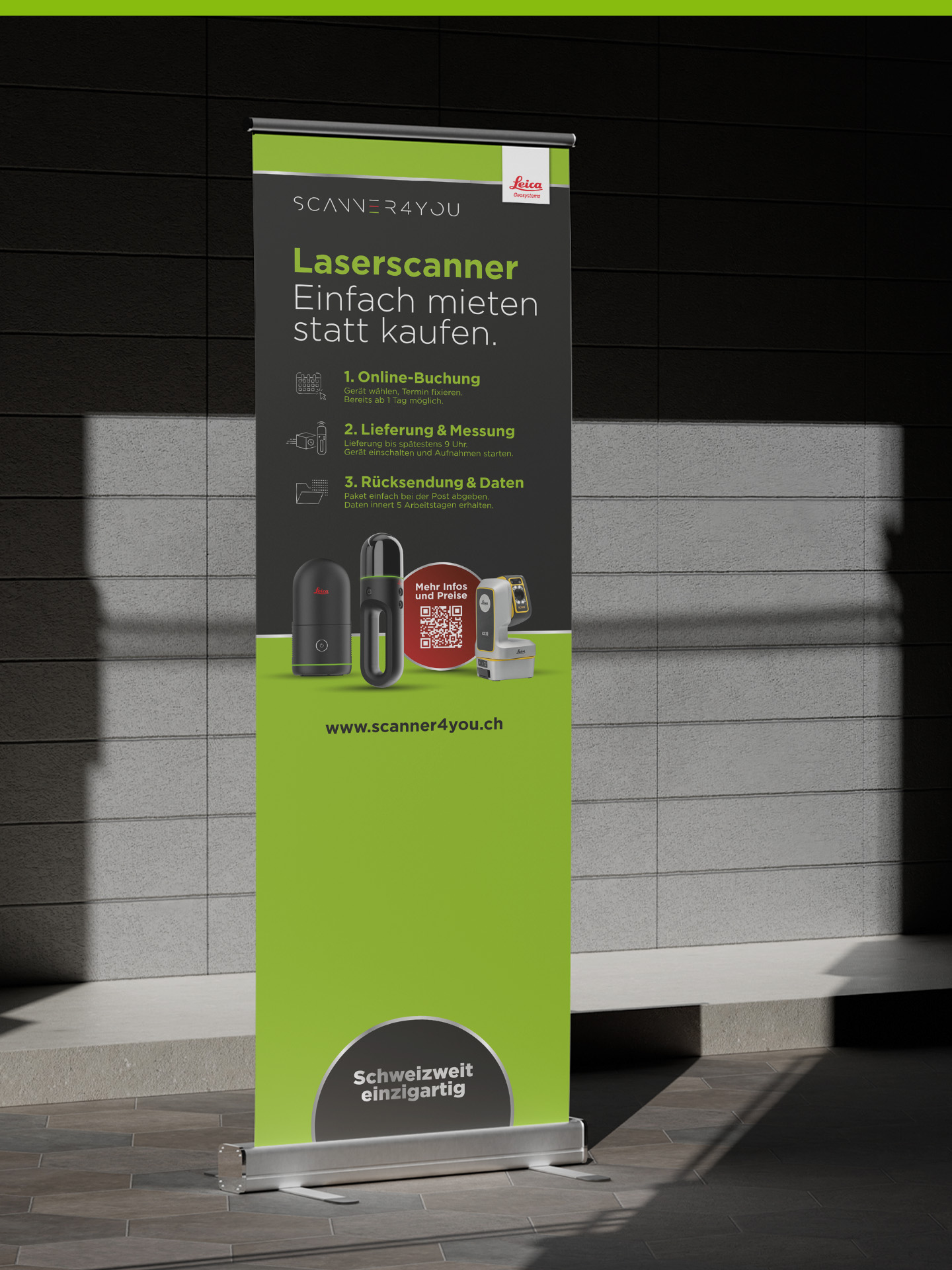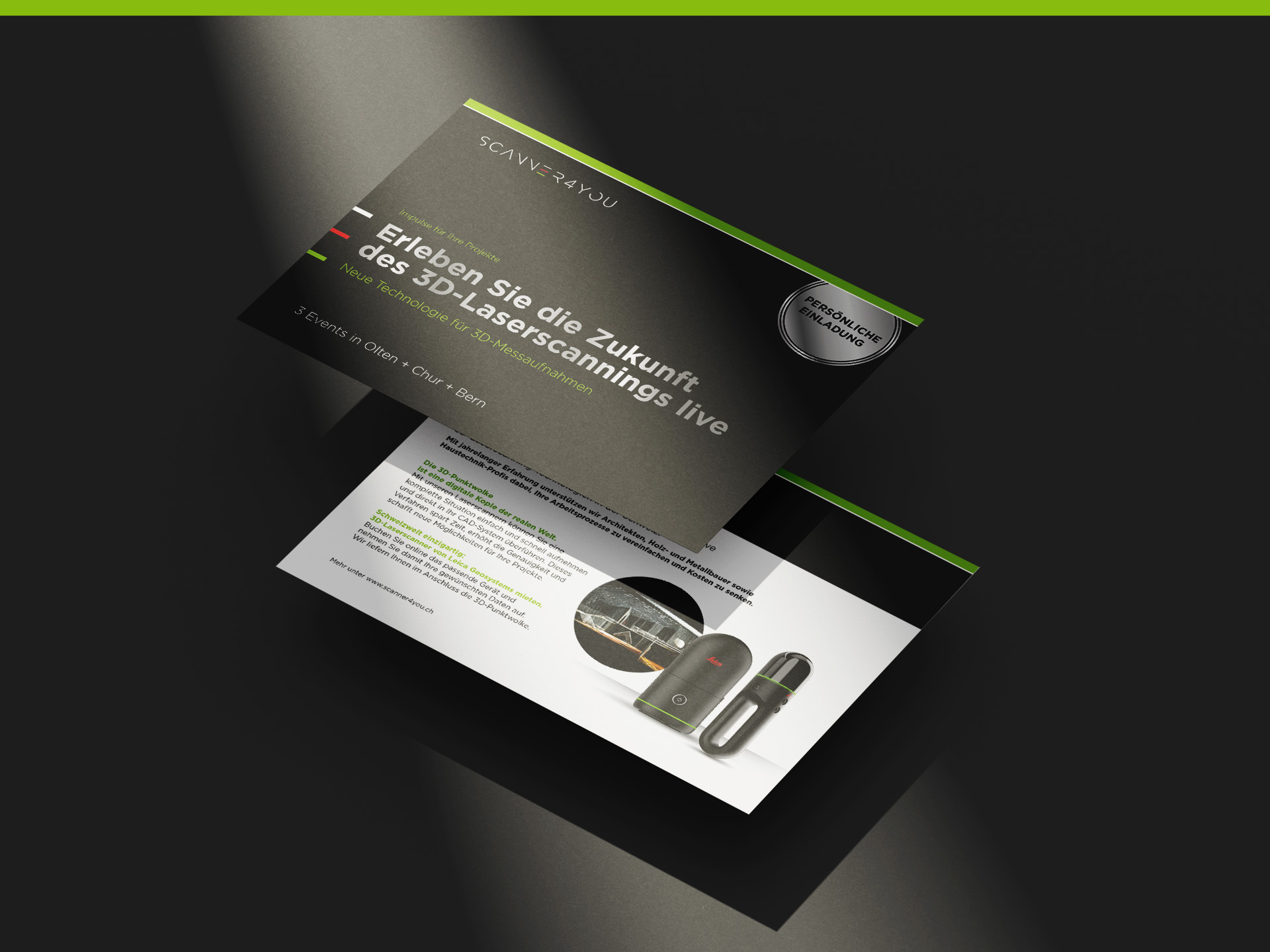Auf Basis des neuen Logos definierten wir Farbwelt, Typografie und Bildstil. Parallel dazu konzipierten und texteten wir eine kompakte Kampagne für Events und Social Media: personalisierte Einladungen zu Fachtagungen, Flyer, Messe-Roll-ups und LED-Banner sowie Posts über mehrere Kanäle hinweg. So wurde der Webshop als Anlaufstelle für 3D-Laserscanning-Lösungen schweizweit sichtbar und die Leads für die Vermietung der Leica-Geräte deutlich gesteigert.